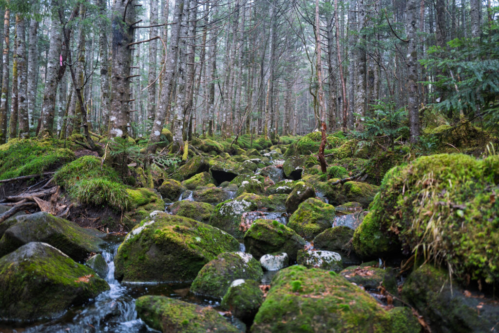 北八ヶ岳らしい岩と苔の景色。前夜に雨が降ったせいか、登山道のところどころに水たまりがありました。