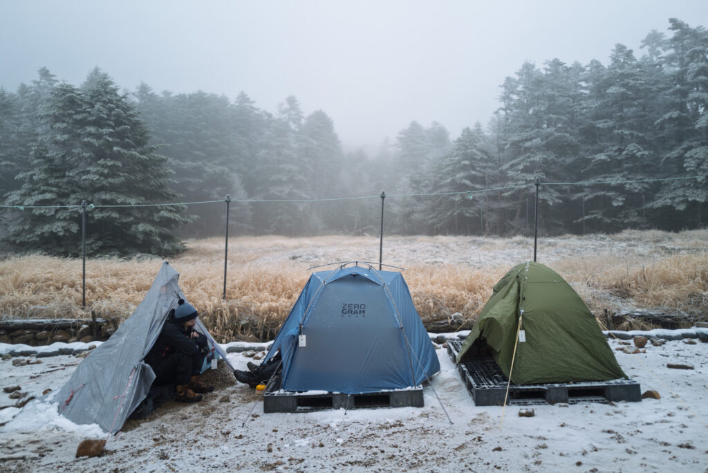 1日目の15時ごろから雪が本降りになり、翌朝のテント場は雪景色。