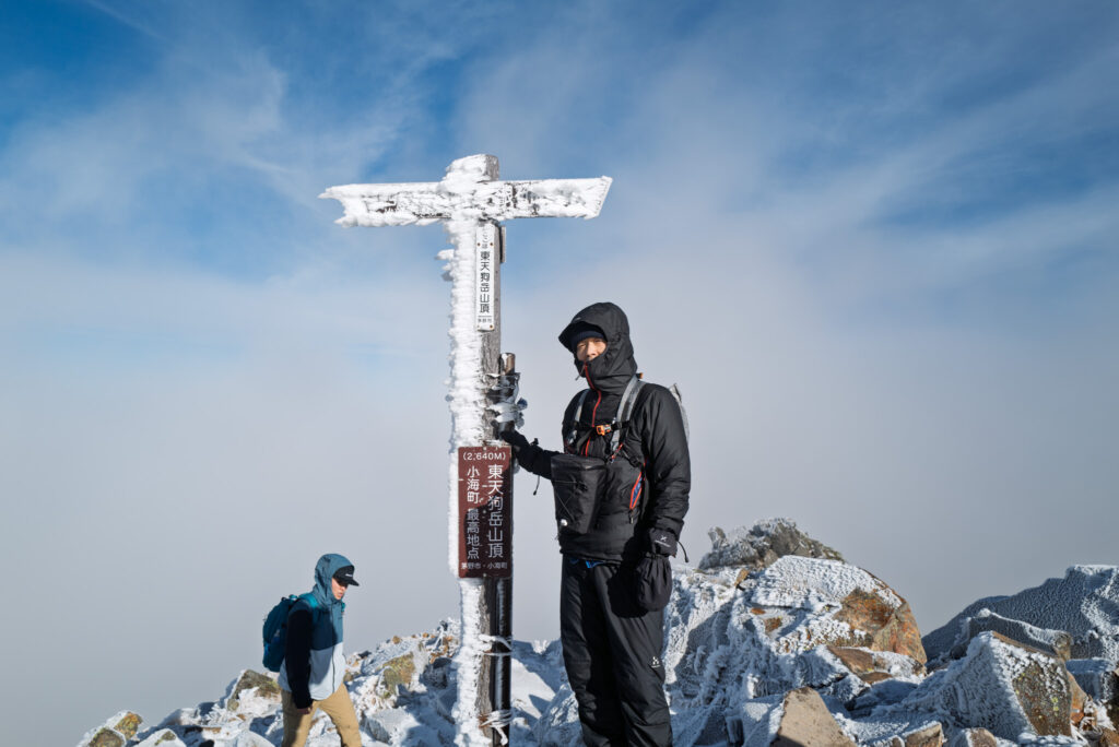 東天狗岳山頂。山頂標識も凍り付いてます。