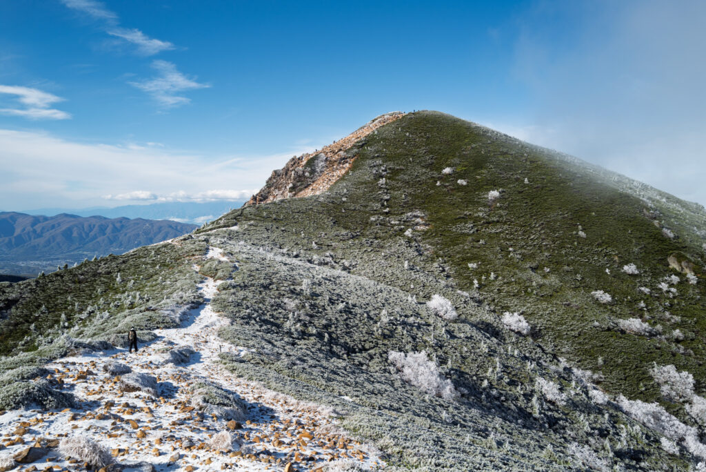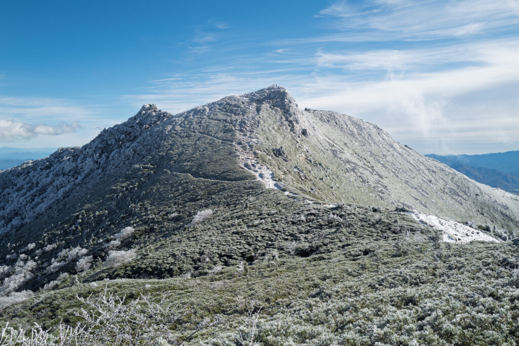 翌朝、薄く雪が積もっていたので、明るくなってから天狗岳に向けて出発。途中であまりの強風だったら撤退する覚悟で向かいましたが、風は吹いているものの思いのほか強くはなく、こちらもガッチリ防寒防風装備だったため、問題なく稜線を進みました。